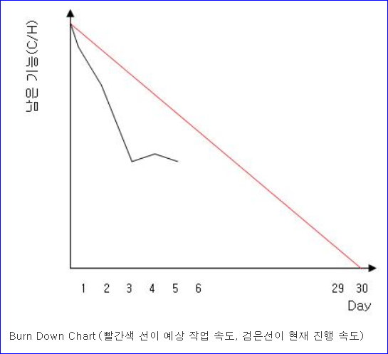 Burn Down Chart 는 남아 있는 일(work)의 양과 시간(time) 사이의 관계를 그래픽으로 표현한 2차원적인 차트이다.